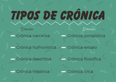 - Crônica Jornalística, que se confunde com a narrativa, falada anteriormente: escreve notícias ou acontecimentos particulares;